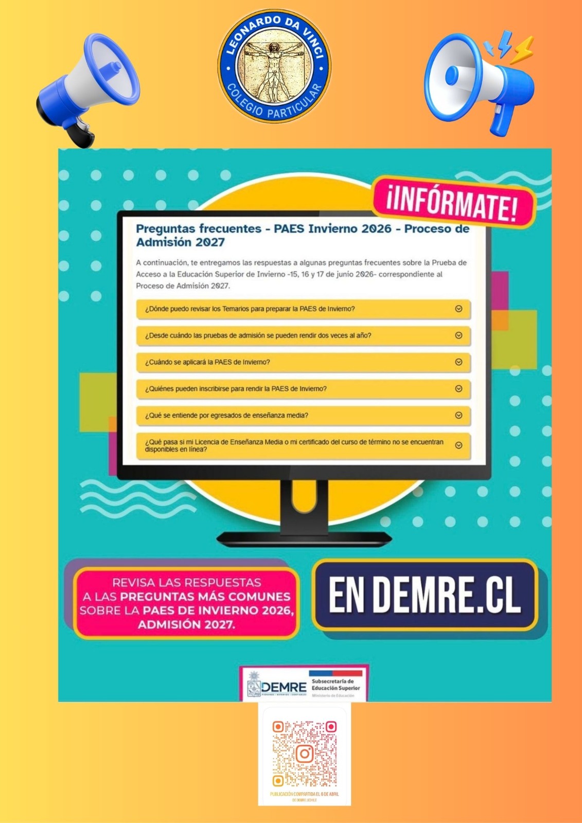 Se informa a la comunidad educativa el calendario correspondiente a la PAES Regular 2026, en el marco del Proceso de Admisión 2027 a la educación superior.