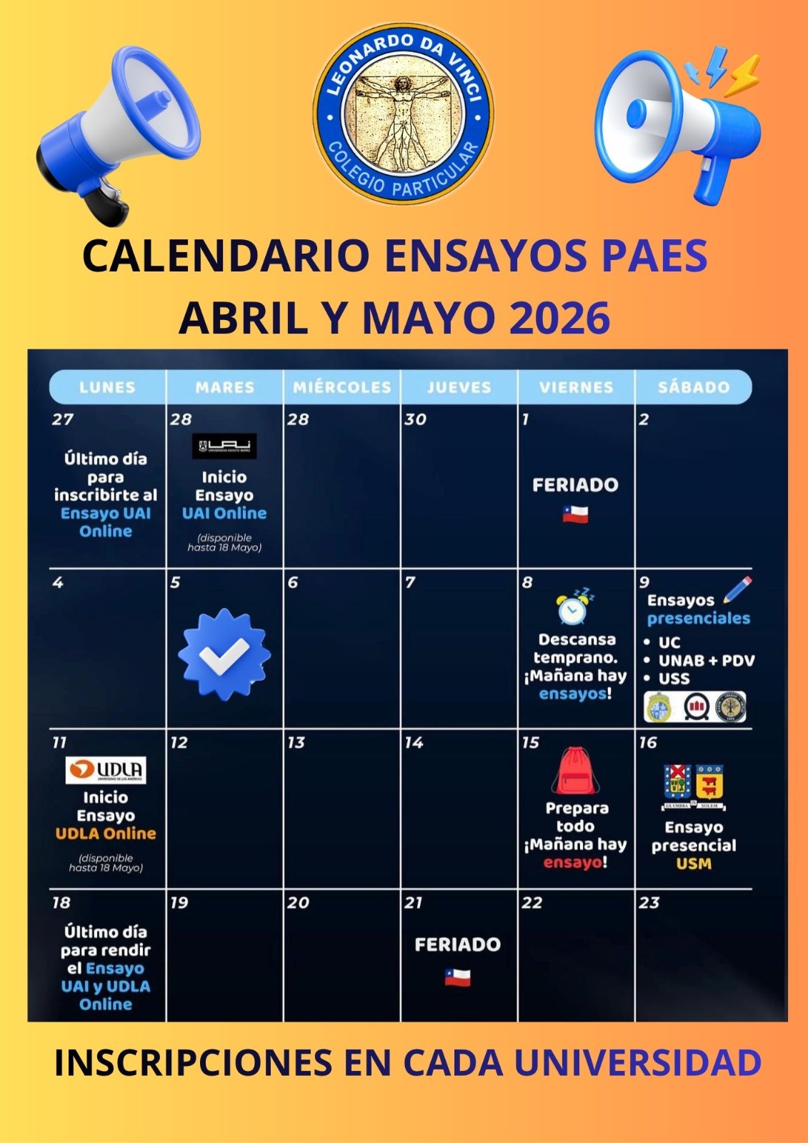 📝 La aplicación de la PAES Regular se realizará durante los días 30 de noviembre, 1 y 2 de diciembre de 2026.