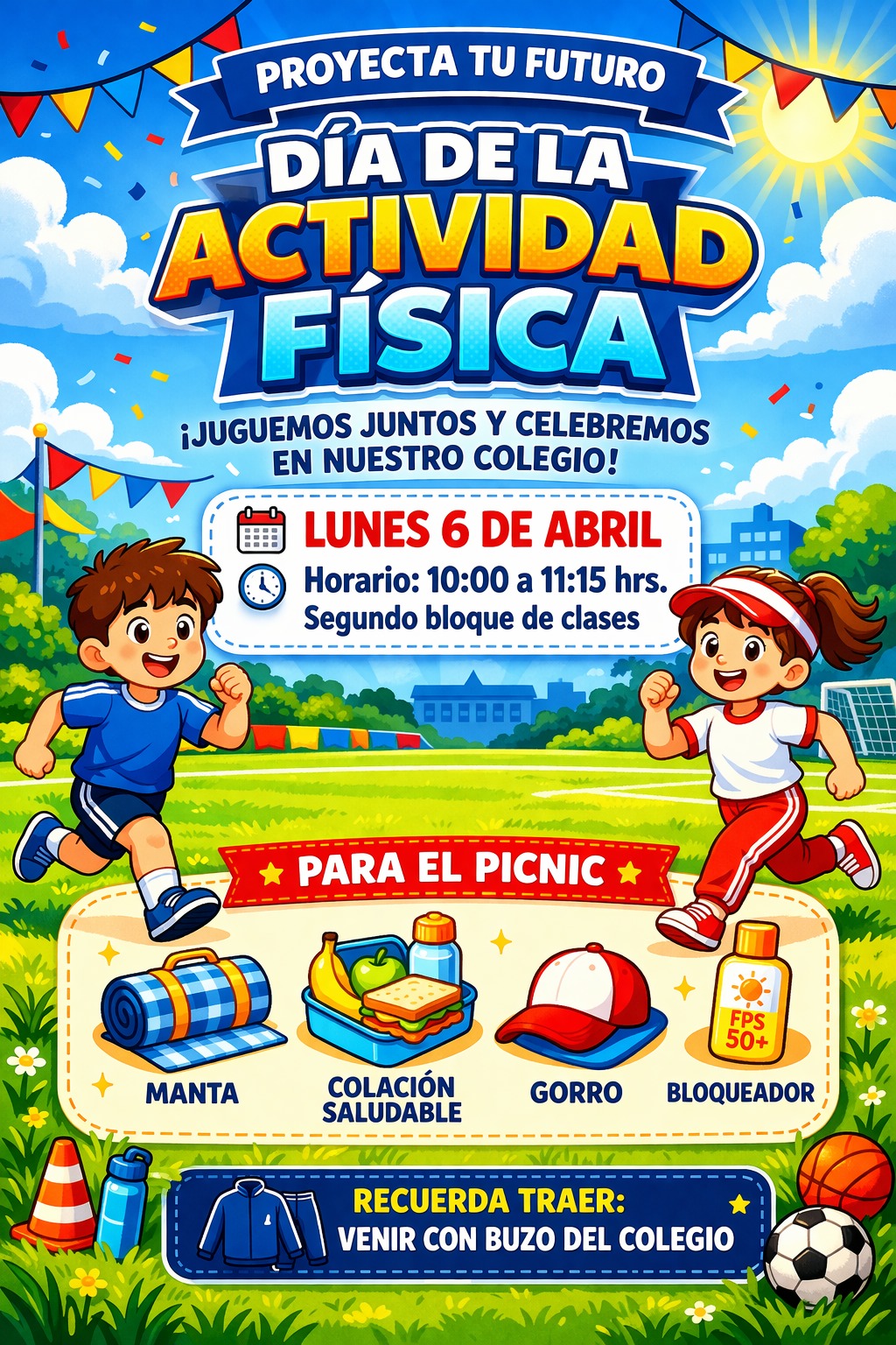 Este lunes 6 de abril viviremos una jornada llena de energía, alegría y movimiento. Será una gran oportunidad para compartir, disfrutar al aire libre y celebrar la importancia de mantenernos activos 💪✨